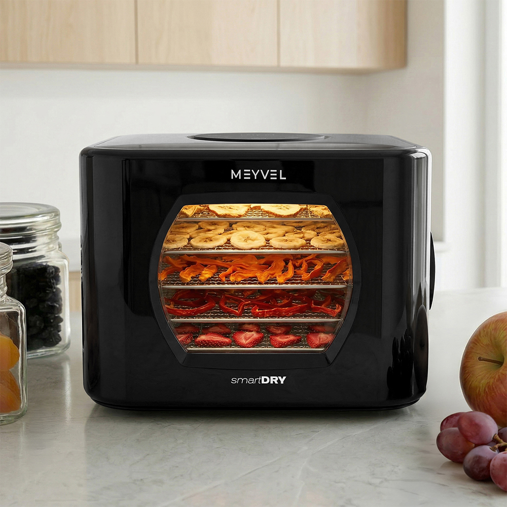 Дегидратор Meyvel MDH5-2P (Чёрный) (Black) бережно высушивает фрукты, овощи, ягоды, зелень, грибы и мясные снеки, сохраняя их вкус, аромат и полезные свойства. Это удобный кухонный помощник, который справляется с сезонными заготовками и повседневными кулинарными задачами.