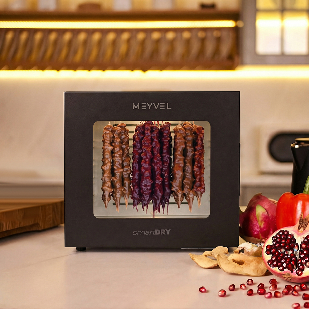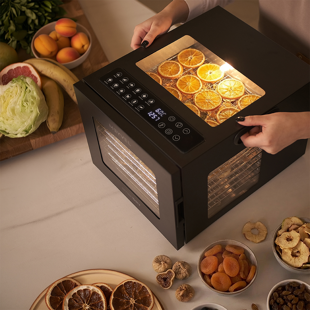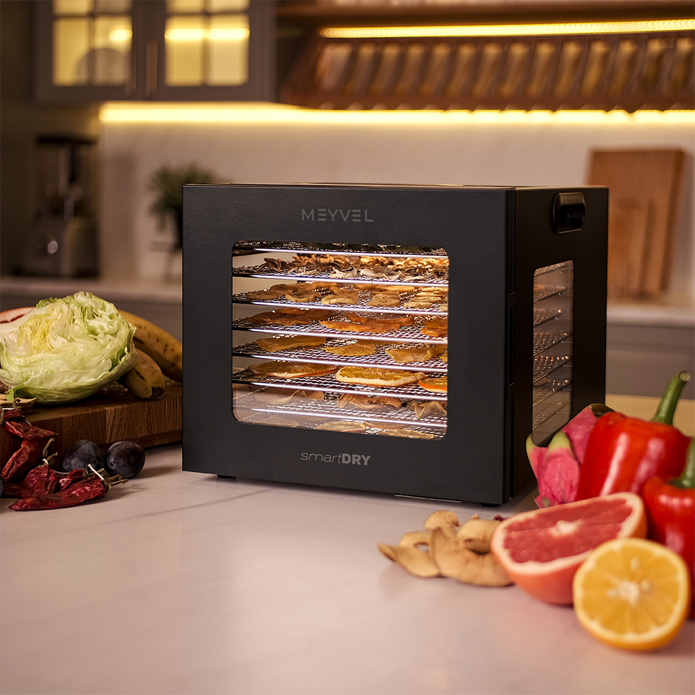 Meyvel MDH8-1S (Black) — это современный дегидратор, который создан для тех, кто хочет заготавливать фрукты, овощи, мясо, травы и ягоды без потери их вкуса и пользы круглый год. Прочный корпус, продуманная конструкция и умная электроника превращают его в надёжного помощника на каждый сезон.