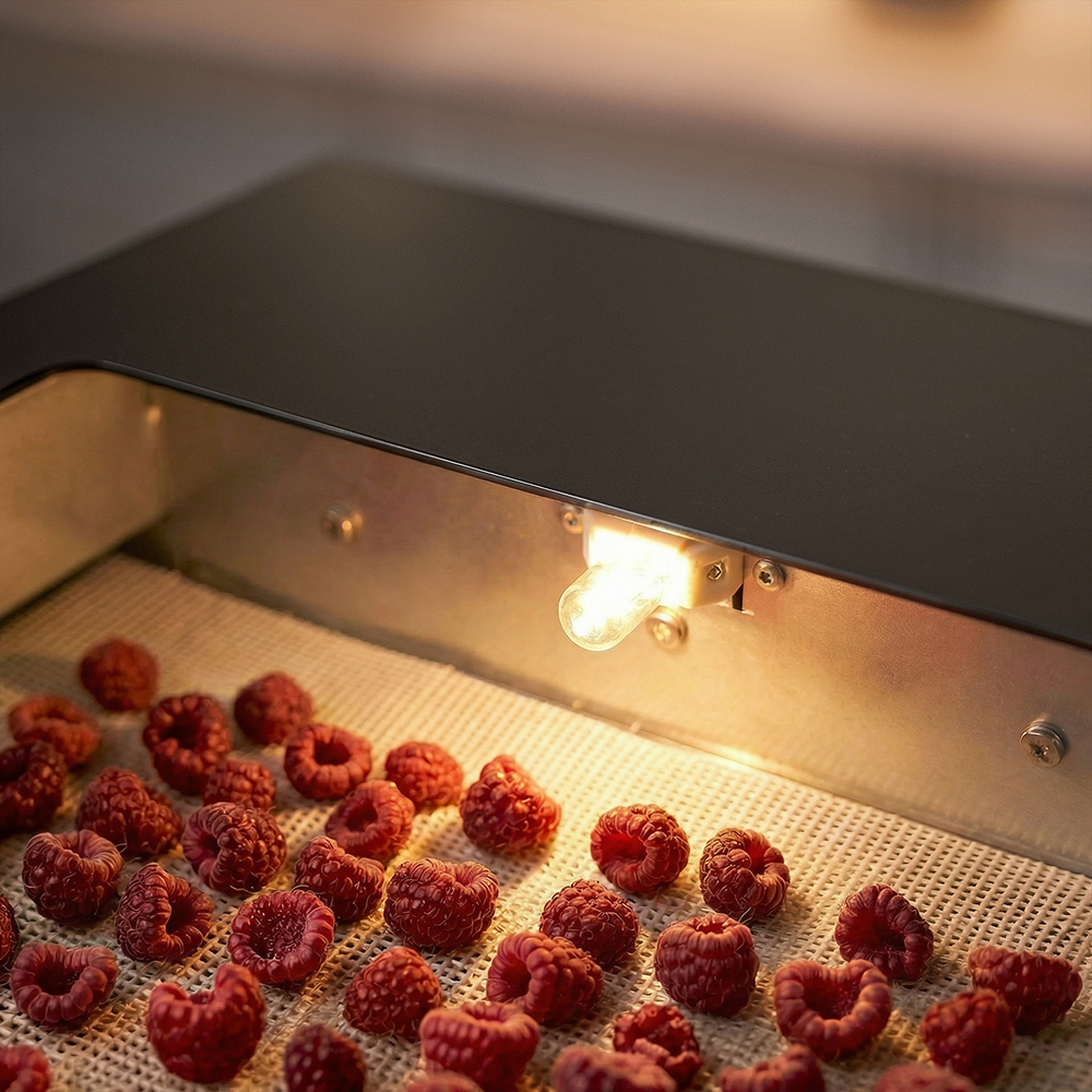 Во время работы камеру можно подсвечивать мягким светом, чтобы следить за процессом, не открывая дверцу и не нарушая температурный баланс.
