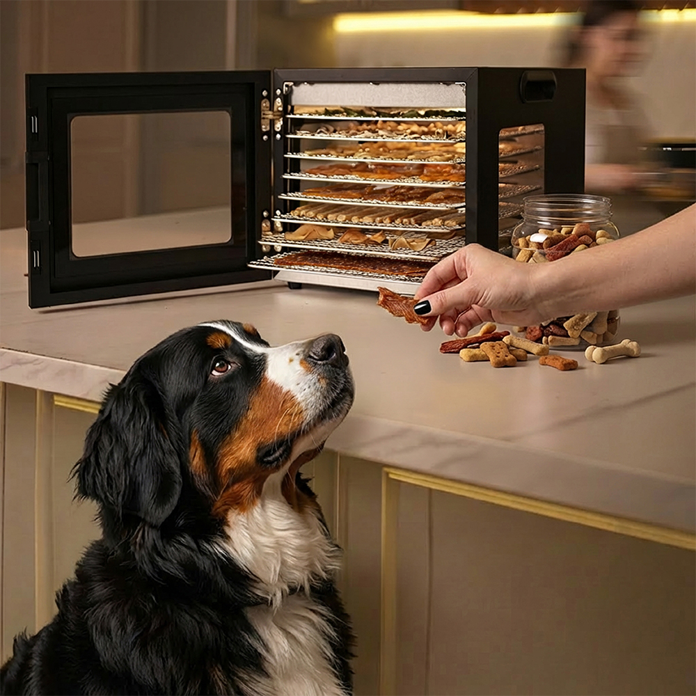 Чёрный корпус из нержавеющей стали, устойчивый к нагреву, влаге и коррозии, выглядит лаконично и современно, легко вписывается в интерьер кухни или мастерской. Внутри установлено 8 поддонов из нержавеющей стали с зазором 25 мм — этого достаточно, чтобы удобно размещать ломтики фруктов, травы или мясные полоски.
