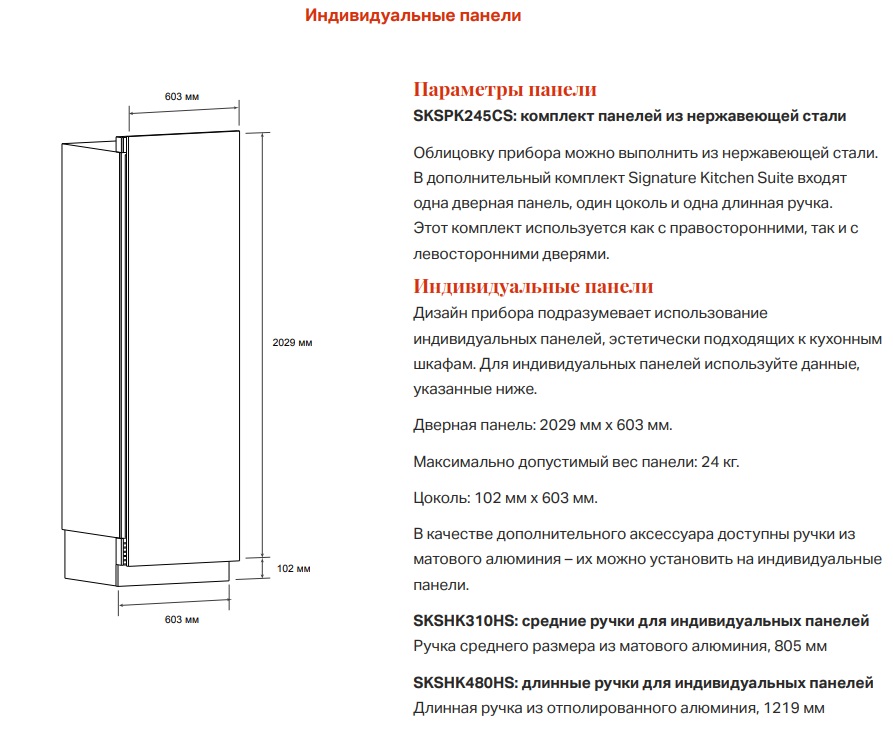 - Комплект панелей/ручек/цоколей из нержавеющей стали: SKSPK245CS