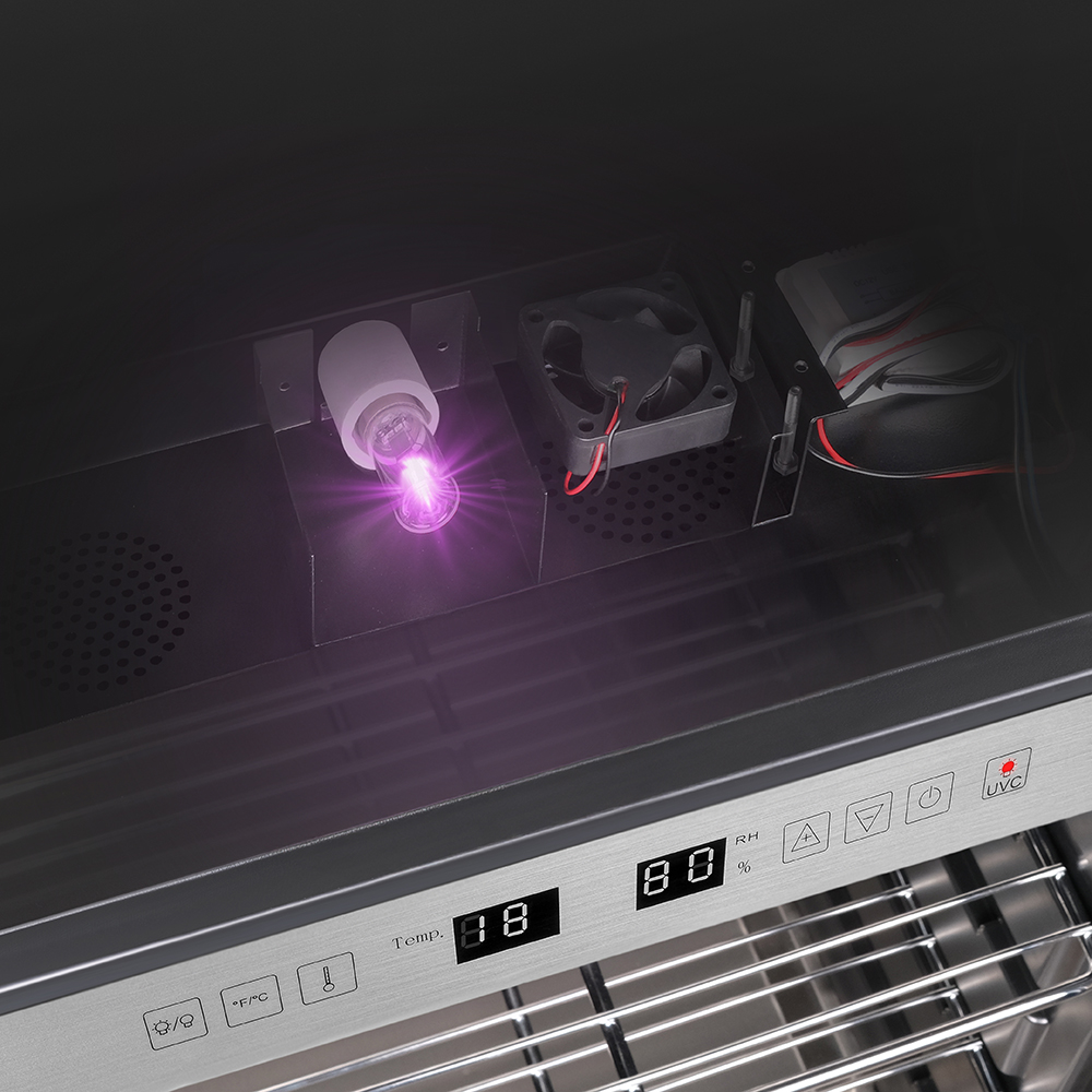 Внутреннее оснащение холодильника продумано до мелочей. Регулируемые ножки позволяют выровнять устройство, а встроенные крюки, поднос для соли и решетка из нержавеющей стали облегчают размещение и сушку содержимого. Резервуар для воды дает возможность контролировать уровень влажности в диапазоне от 60 до 85%, что важно для равномерного вызревания.